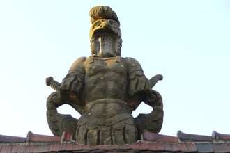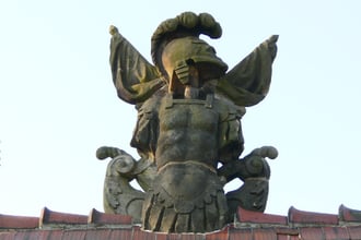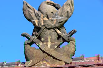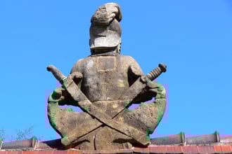 ALS ABSCHRECKUNG UND ZUR ERINNERUNG WURDEN SPÄTER DREI RITTERSKULPTUREN AUS SANDSTEIN GEFERTIGT UND AUF DAS HAUPTTOR ZUM SCHLOß GESETZT.